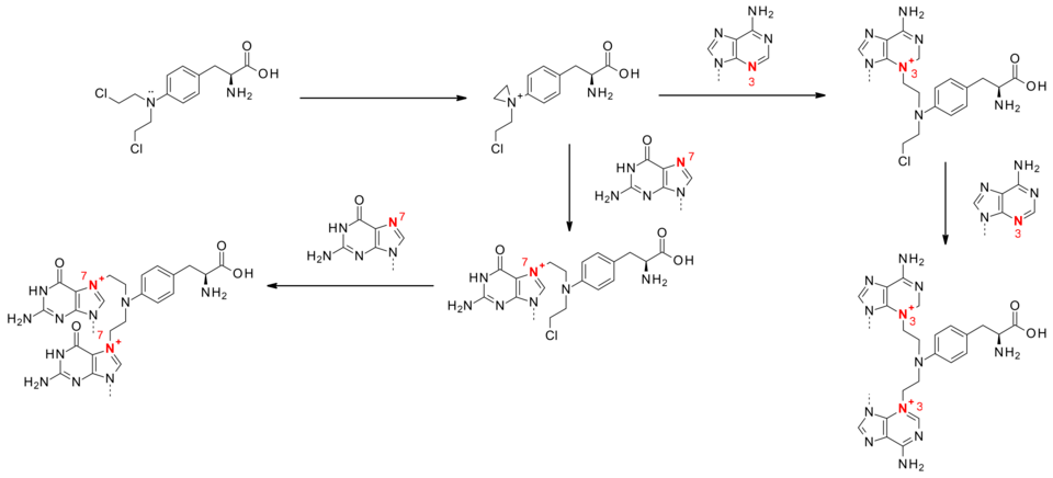 The alkylation mechanism of melphalan is shared by all nitrogen mustards, proceeding through the formation of an aziridinium cation. This highly reactive intermediate interacts with nitrogen atoms in nucleotide bases, generating positively charged adducts.[15]