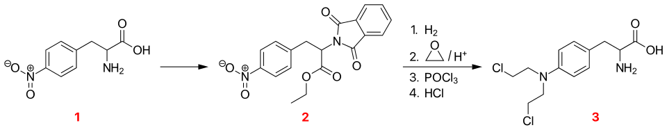 4-Nitro-L-phenylalanine (1) was converted to its phthalimide by heating with phthalic anhydride, and this was converted to its ethyl ester (2). Catalytic hydrogenation produced the corresponding aniline. Heating in acid with oxirane, followed by treatment with phosphorus oxychloride provided the bischloride, and removal of the protecting groups by heating in hydrochloric acid gave melphalan (3).