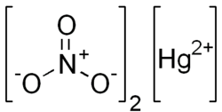 Mercury(II) nitrate is an inorganic compound with the chemical formula Hg(NO3)2. It is the mercury(II) salt of nitric acid HNO3. It contains mercury(II) cations Hg2+ and nitrate anions NO−3, and water of crystallization H2O in the case of a hydrous salt. Mercury(II) nitrate forms hydrates Hg(NO3)2·xH2O. Anhydrous and hydrous salts are colorless or white soluble crystalline solids that are occasionally used as a reagents. Mercury(II) nitrate is made by treating mercury with hot concentrated nitric acid. Neither anhydrous nor monohydrate has been confirmed by X-ray crystallography.[1] The anhydrous material is more widely used.