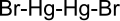 In common with other Hg(I) (mercurous) compounds which contain linear X-Hg-Hg-X units, Hg2Br2 contains linear BrHg2Br units with an Hg-Hg bond length of 249 pm (Hg-Hg in the metal is 300 pm) and an Hg-Br bond length of 271 pm.[5] The overall coordination of each Hg atom is octahedral as, in addition to the two nearest neighbours, there are four other Br atoms at 332 pm.[5] The compound is often formulated as Hg22+ 2Br−,[6] although it is actually a molecular compound.