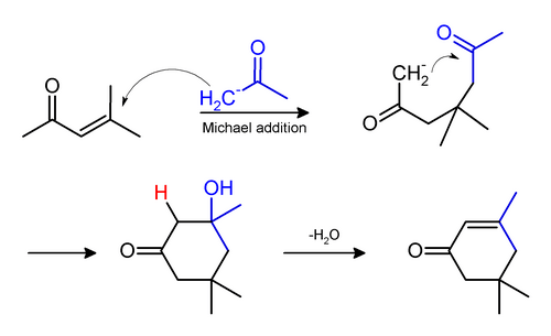 Phorone and isophorone may be formed under the same conditions. Isophorone originates via a Michael addition: