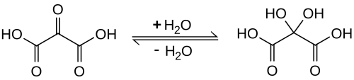 Mesoxalic acid readily absorbs and reacts with water to form a product commonly called "mesoxalic acid monohydrate", more properly dihydroxymalonic acid, HO−(C=O)−C(OH)2−(C=O)−OH.[2] In product catalogs and other contexts, the terms "mesoxalic acid", "oxomalonic acid" and so on often refer to this "hydrated" compound. In particular, the product traded as "sodium mesoxalate monohydrate" is almost always sodium dihydroxymalonate.