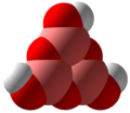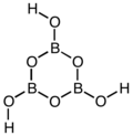 - Modification III, or trimeric, with the molecular formula H3B3O6. The molecule has C3h symmetry, with a six-member ring of alternating boron and oxygen atoms at the core, with OH groups attached to the borons. The crystal structure is orthorhombic with a sheet-like structure, similar to that of boric acid itself.[3] It is obtained by heating orthoboric acid at 80-100 °C, with loss of water:[3]