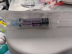 Metaraminol, also known as metaradrine and sold under the brand name Aramine among others, is a sympathomimetic medication which is used in the prevention and treatment of hypotension (low blood pressure), particularly as a complication of anesthesia.[1][3][4] It is given by intramuscular or intravenous administration.[1]