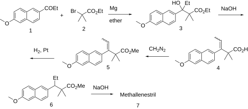 The Grignard reaction between 2-propionyl-6-methoxynaphthalene (promen) [2700-47-2] (1) and Ethyl 2-bromoisobutyrate [600-00-0] (2) occurs to give Ethyl beta-ethyl-beta-hydroxy-6-methoxy-alpha,alpha-dimethylnaphthalene-2-propionate [85536-81-8] (3). Dehydration of the carbinol in aqueous lye may be accompanied by saponification of the ester (although not in the patented version) to give [60533-05-3] (4). Re-esterification with diazomethane gave (5). Catalytic hydrogenation of the olefin led to PC608080 (6). Saponification of the ester completed the synthesis of Methallenestril (7).