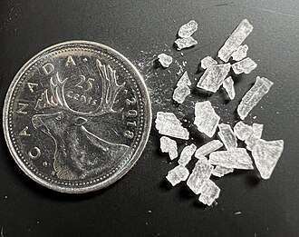Methamphetamine[note 1] is a central nervous system (CNS) stimulant that is primarily used as a recreational or performance-enhancing drug and less commonly as a second-line treatment for attention deficit hyperactivity disorder (ADHD).[25] It has also been researched as a potential treatment for traumatic brain injury.[7] Methamphetamine was discovered in 1893 and exists as two enantiomers: levo-methamphetamine and dextro-methamphetamine.[note 2] Methamphetamine properly refers to a specific chemical substance, the racemic free base, which is an equal mixture of levomethamphetamine and dextromethamphetamine in their pure amine forms, but the hydrochloride salt, commonly called crystal meth, is widely used. Methamphetamine is rarely prescribed over concerns involving its potential for misuse as an aphrodisiac and euphoriant, among other concerns, as well as the availability of other drugs with comparable effects and treatment efficacy such as dextroamphetamine and lisdexamfetamine.[25] While pharmaceutical formulations of methamphetamine in the United States are labeled as methamphetamine hydrochloride, they contain dextromethamphetamine as the active ingredient.[25][note 3] Dextromethamphetamine is a stronger CNS stimulant than levomethamphetamine.[25]