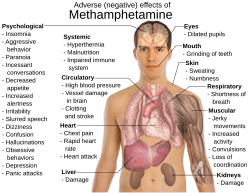 The effects of methamphetamine are nearly identical to other substituted amphetamine.[31] In low to moderate and therapeutic doses (5–25 mg orally),[27] methamphetamine produces typical SNDRA effects and may elevate mood, increase alertness, concentration, and energy, reduce appetite, and promote weight loss. In overdose or during extended binges, it may induce psychosis, breakdown of skeletal muscle, seizures, and bleeding in the brain. Chronic high-dose use can precipitate unpredictable and rapid mood swings, stimulant psychosis (e.g., paranoia, hallucinations, delirium, and delusions), and aggression. Recreationally, methamphetamine's ability to increase energy has been reported to lift mood and increase sexual desire to such an extent that users are able to engage in sexual activity continuously for several days while binging the drug.[32] Methamphetamine is known to possess a high abuse liability (a high likelihood that extratherapeutic use will lead to compulsive drug use) and high psychological dependence liability (a high likelihood that withdrawal symptoms will occur when methamphetamine use ceases). Discontinuing methamphetamine after heavy use may lead to a post-acute-withdrawal syndrome, which can persist for months beyond the typical withdrawal period. At high doses, like other substituted amphetamines, methamphetamine is neurotoxic to human midbrain dopaminergic neurons and, to a lesser extent, serotonergic neurons.[33][34][31] Methamphetamine neurotoxicity causes adverse changes in brain structure and function, such as reductions in grey matter volume in several brain regions, as well as adverse changes in markers of metabolic integrity.[34]