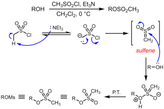 Methanesulfonyl chloride is mainly used to give methanesulfonates by its reaction with alcohols in the presence of a non-nucleophilic base.[8] In contrast to the formation of toluenesulfonates from alcohols and p-toluenesulfonyl chloride in the presence of pyridine, the formation of methanesulfonates is believed to proceed via a mechanism wherein methanesulfonyl chloride first undergoes an E1cB elimination to generate the highly reactive parent sulfene (CH2=SO2), followed by attack by the alcohol and rapid proton transfer to generate the observed product. This mechanistic proposal is supported by isotope labeling experiments and the trapping of the transient sulfene as cycloadducts.[9]