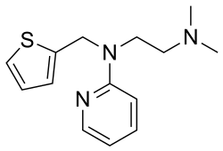 Methapyrilene is an antihistamine and anticholinergic of the pyridine chemical class which was developed in the early 1950s. It was sold under the trade names Co-Pyronil and Histadyl EC in the UK.[1] It has relatively strong sedative effects, to the extent that its primary use was as a medication for insomnia rather than for its antihistamine action. Together with scopolamine, it was the main ingredient in Sominex, Nytol, and Sleep-Eze. It also provided the sedative component of Excedrin PM.[2] All of these products were reformulated in the late 1970s[3] when methapyrilene was demonstrated to cause liver cancer in rats when given chronically.[4]