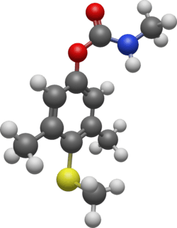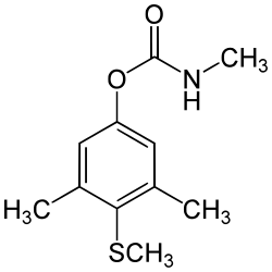 Methiocarb is a carbamate pesticide (an acetylcholinesterase inhibitor) which is used as an insecticide,[1][2] bird repellent,[3] acaricide[2] and molluscicide[2] since the 1960s. Methiocarb has contact and stomach action on mites and neurotoxic effects on molluscs. Seeds treated with methiocarb also affect birds. Other names for methiocarb are mesurol[4] and mercaptodimethur.