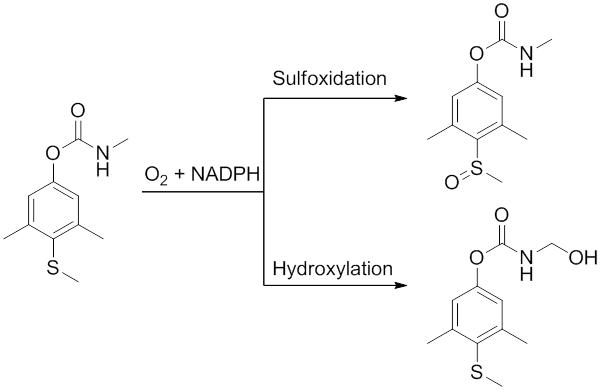 Methiocarb is biotransformed in the liver mainly by sulfoxidation. This can happen to methiocarb itself but also to the phenol group which is cleaved from methiocarb by choline-esterase. In some cases this same sulfur can be oxidised once more to give the sulfone. A minor pathway that occurs is the hydroxylation of the N-methyl.[8][9]