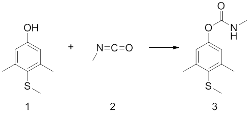 Methiocarb (3) is synthesised by Bayer from 4-methylthio-3,5-xylenol (1) and methyl isocyanate (2).[6] The xylenol (1) will act as the nucleophile in this reaction attacking the partially positively charged carbon in the isocyanate (2).