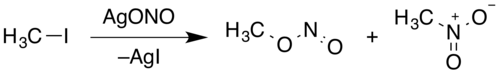 Methyl nitrite can be prepared by the reaction of silver nitrite with iodomethane: Silver nitrite (AgNO2) exists in solution as the silver ion, Ag+ and the nitrite ion, NO2−. One of the lone pairs on an oxygen from nitrite ion attacks the methyl group (−CH3), releasing the iodide ion into solution.[4] Unlike silver nitrite, silver iodide is highly insoluble in water and thus forms a solid.[5] Note that nitrogen is a better nucleophile than oxygen and most nitrites would react via an SN2-like mechanism and the major product would be nitromethane. For example, sodium and potassium nitrite reacting with iodomethane would produce mostly nitromethane, with methyl nitrite as the minor product. However, the presence of the silver ion in solution has a stabilizing effect on the formation of carbocation intermediates, increasing the percent yield of methyl nitrite. In either case, some nitromethane and methyl nitrite are both formed.[4]