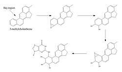A possible mechanism for this reaction is depicted in figure (2). 3-MC is metabolized, via epoxidation, hydrolysis and another epoxidation, to a very reactive epoxide. Epoxidations are realized by the enzyme cytochrome P450. The second epoxide is not hydrolysed immediately because it is localized next to a bay region, which shields the epoxide. This way, the metabolite is able to travel and bind to DNA in figure (2). The mechanism is derived from the binding mechanism of benzo[a]pyrene to DNA. This is likely because it is plausible that two polycyclic aromatic hydrocarbons are metabolized via the same pathway. Deoxyguanosine is used in the figure, since that base appears to be bound to Benzo[a]pyrene far more often than the other bases.[8][9]