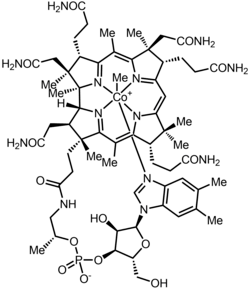 Methylcobalamin (mecobalamin, MeCbl, or MeB12) is a cobalamin, a form of vitamin B12. It differs from cyanocobalamin in that the cyano group at the cobalt is replaced with a methyl group.[1] Methylcobalamin features an octahedral cobalt(III) centre and can be obtained as bright red crystals.[2] From the perspective of coordination chemistry, methylcobalamin is notable as a rare example of a compound that contains metal–alkyl bonds. Nickel–methyl intermediates have been proposed for the final step of methanogenesis.