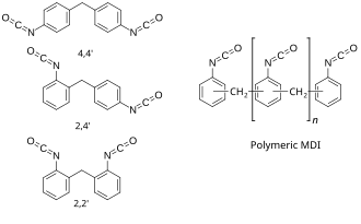 Methylene diphenyl diisocyanate (MDI) is an aromatic diisocyanate. Three isomers are common, varying by the positions of the isocyanate groups around the rings: 2,2′-MDI, 2,4′-MDI, and 4,4′-MDI. The 4,4′ isomer is most widely used, and is also known as 4,4′-diphenylmethane diisocyanate.[3] This isomer is also known as Pure MDI. MDI reacts with polyols in the manufacture of polyurethane. It is the most produced diisocyanate, accounting for 61.3% of the global market in the year 2000.[4]