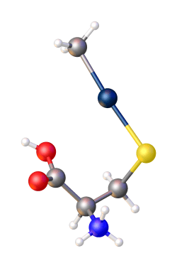 Ingested methylmercury is readily and completely absorbed by the gastrointestinal tract. It is mostly found complexed with free cysteine and with proteins and peptides containing that amino acid. The methylmercuric-cysteinyl complex is recognized by amino acids transporting proteins in the body as methionine, another essential amino acid.[28] Because of this mimicry, it is transported freely throughout the body including across the blood–brain barrier and across the placenta, where it is absorbed by the developing fetus. Also for this reason as well as its strong binding to proteins, methylmercury is not readily eliminated. Methylmercury has an elimination half-life in human blood of about 50 days,[29] varying by age, sex, and body weight.[30]