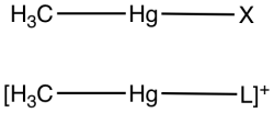 "Methylmercury" is a shorthand for the hypothetical "methylmercury cation", sometimes written methylmercury(1+) cation or methylmercury(II) cation. This functional group is composed of a methyl group bonded to an atom of mercury. Its chemical formula is CH3Hg+ (sometimes written as MeHg+). The Methylmercury compound has an overall charge of +1, with Hg in the +2 oxidation state. Methylmercury exists as a substituent in many complexes of the type [MeHgL]+ (L = Lewis base) and MeHgX (X = anion).[2]