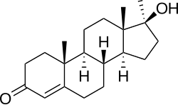 Methyltestosterone, also known as 17α-methyltestosterone or as 17α-methylandrost-4-en-17β-ol-3-one, is a synthetic, 17α-alkylated androstane steroid and a derivative of testosterone differing from it only in the presence of a methyl group at the C17α position.[1][2][4] Close synthetic relatives of methyltestosterone include metandienone (17α-methyl-δ1-testosterone) and fluoxymesterone (9α-fluoro-11β-hydroxy-17α-methyltestosterone).[4][24]