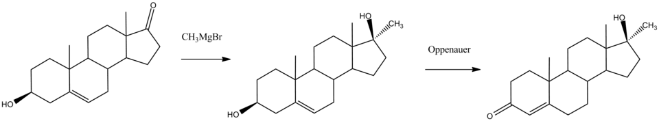 A chemical synthesis of methyltestosterone from dehydroepiandrosterone (DHEA) with methandriol as an intermediate proceeds as follows:[31][32]