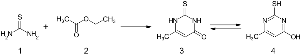 Methylthiouracil is prepared quite simply by condensation of ethyl acetoacetate with thiourea.[2]