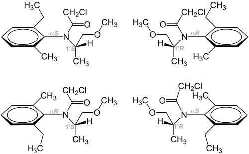 Metolachlor is a popular herbicide in the United States.[6] As originally formulated metolachlor was applied as a racemate, a 1:1 mixture of the (S)- and (R)-stereoisomers. The (R)-enantiomer is less active, and modern production methods afford a higher concentration of S-metolachlor, thus current application rates are far lower than original formulations.