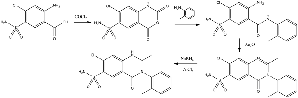 Thus, reaction of (1) with phosgene gives the reactive the isatoic anhydride (2). Condensation of that with ortho-toluidine leads to the acylation product (3) formed with a simultaneous loss of carbon dioxide. This is then converted to the quinazolone (4) by heating with acetic anhydride. Reaction with sodium borohydride in the presence of aluminum chloride selectively reduces the double bond to yield the diuretic agent metolazone (5).