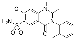 - ^ Shetty BV, Campanella LA, Thomas TL, Fedorchuk M, Davidson TA, Michelson L, et al. (September 1970). "Synthesis and activity of some 3-aryl- and 3-aralkyl-1,2,3,4-tetrahydro-4-oxo-6-quinazolinesulfonamides". Journal of Medicinal Chemistry. 13 (5): 886–95. doi:10.1021/jm00299a022. PMID 5458377.