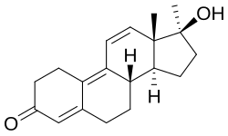 Metribolone, also known as 17α-methyltrenbolone, as well as 17α-methyl-δ9,11-19-nortestosterone or 17α-methylestra-4,9,11-trien-17β-ol-3-one, is a synthetic estrane steroid and a 17α-alkylated derivative of nandrolone (19-nortestosterone).[1][2] It is the C17α methylated derivative of trenbolone (δ9,11-19-nortestosterone) and the C9- and C11-dehydrogenated (δ9,11) analogue of normethandrone (17α-methyl-19-nortestosterone).[1][2] Other close relatives and derivatives of metribolone include mibolerone (7α,17α-dimethyl-19-nortestosterone) and dimethyltrienolone (RU-2420; 7α,17α-dimethyl-δ9,11-19-nortestosterone).[1][2] In addition to AAS, trimethyltrienolone (R2956; 2α,2β,17α-trimethyl-δ9,11-19-nortestosterone), a highly potent antiandrogen, has been derived from metribolone.[13][14]