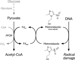 Metronidazole is of the nitroimidazole class. It is a prodrug that inhibits nucleic acid synthesis by forming nitroso radicals, which disrupt the DNA of microbial cells.[7][63] Metronidazole activates by receiving an electron from the reduced ferredoxin produced by pyruvate synthase (PFOR) in anaerobic organisms, equivalent to pyruvate dehydrogenase in aerobic organisms, thus turning into a highly reactive radical anion. After the radical loses the electron to its target, it recycles back to the unactivated form of metronidazole, ready to be activated again.[64]