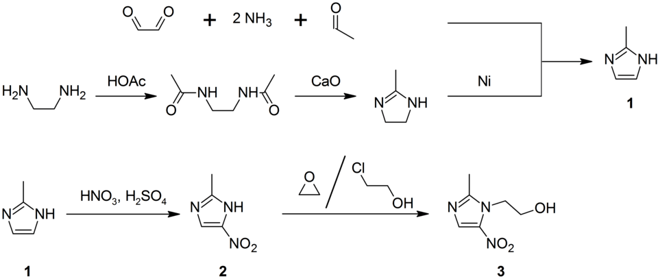 - ^ Kraft MY, Kochergin PM, Tsyganova AM, Shlikhunova VS (1989). "Synthesis of metronidazole from ethylenediamine". Pharmaceutical Chemistry Journal. 23 (10): 861–863. doi:10.1007/BF00764821. S2CID 38187002.