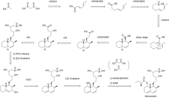 Biosynthesis of mevastatin is primarily accomplished via a type 1 PKS pathway it proceeds in the PKS pathway as seen in figure 1 until it reaches a hexaketide state where it undergoes a Diels-Alder cyclization. After cyclization it continues via the PKS pathway to a nonaketide after which it is released and undergoes oxidation and dehydration. It is presumed that the oxidations are preformed by a polypeptide that is similar to cytochrome p450 monooxygenase, which is encoded by mlcC within the mevastatin gene. Lastly the biosynthesis is completed by the PKS facilitating the addition of a diketide sidechain and a methylation by SAM.[7] Figure 1 shows mevastatin in its acid form but it can also be in the more commonly seen lactone form. This pathway was first observed in Penicillium cilrinum and was later discovered that another type of fungus, Penicillium brevicompaetum also produced mevastatin via a PKS pathway.