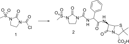 Mezlocillin can be made in a variety of ways including reaction of ampicillin with chlorocarbamate 1 in the presence of triethylamine. Chlorocarbamate 1 itself is made from ethylenediamine by reaction with phosgene to form the cyclic urea followed by monoamide formation with methanesulfonyl chloride and then reaction of the other nitrogen atom with phosgene and trimethylsilylchloride.