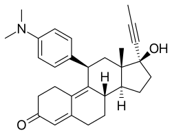 Mifepristone, also known as 11β-(4-(dimethylamino)phenyl)-17α-(1-propynyl)estra-4,9-dien-17β-ol-3-one, is a synthetic estrane steroid and a derivative of steroid hormones like progesterone, cortisol, and testosterone.[47] It has substitutions at the C11β and C17α positions and double bonds at the C4(5) and C9(10) positions.[47]