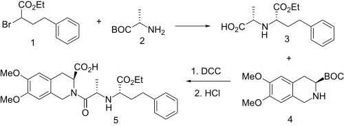 The synthesis of the all-important dipeptide-like side chain involves alkylation of the tert-butyl ester of L-alanine (2) with ethyl 2-bromo-4-phenylbutanoate (1); the presominane of the desired isomer is attributable to asymmetric induction from the adjacent chiral center. Reaction of the product with hydrogen chloride then cleaves the tert-butyl group to give the half acid (3).[19] Coupling of that acid to the secondary amine on tetrahydroisoquinoline (4) gives the corresponding amine. The tert-butyl ester in this product is again cleaved with hydrogen chloride to afford moexipril (5).