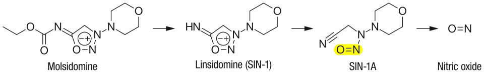 Molsidomine (trade names Corvasal, Corvaton and many others) is an orally active, short acting vasodilating drug used to treat angina pectoris. Molsidomine is metabolized in the liver to the active metabolite linsidomine. Linsidomine is an unstable compound that releases nitric oxide (NO) upon decay as the actual vasodilating compound.[1]
