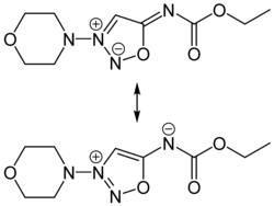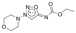 Molsidomine and linsidomine are sydnone imines, a class of mesoionic heterocyclic aromatic chemical compounds. Molsidomine melts at 140–141 °C (284–286 °F), is freely soluble in chloroform, soluble in aqueous hydrochloric acid, ethanol, ethyl acetate and methanol, sparingly soluble in water and acetone, and very slightly soluble in diethyl ether and petroleum ether. It is stable in aqueous solutions at pH 5–7, but not in alkaline solutions. Its absorption maximum is in the near ultraviolet, at 326 nm, in chloroform. The substance is sensitive to ultraviolet light at wavelengths shorter than 320 nm.[3]