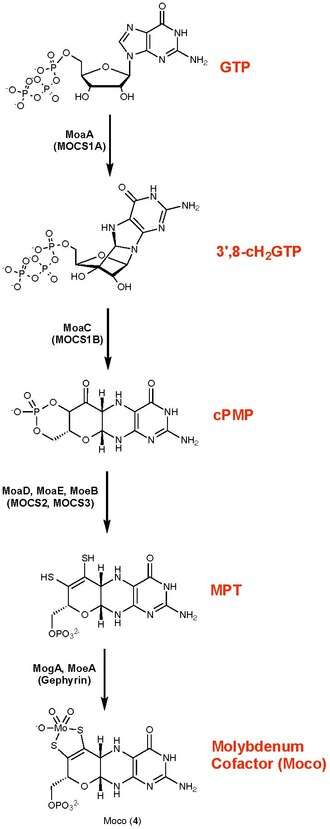Unlike many other cofactors, molybdenum cofactor (Moco) cannot be taken up as a nutrient. The cofactor thus requires de novo biosynthesis. Molybdenum cofactor biosynthesis occurs in four steps: (i) the radical-mediated cyclization of nucleotide, guanosine triphosphate (GTP), to (8S)‑3',8‐cyclo‑7,8‑dihydroguanosine 5'‑triphosphate (3',8‑cH2GTP), (ii) the formation of cyclic pyranopterin monophosphate (cPMP) from the 3',8‑cH2GTP, (iii) the conversion of cPMP into molybdopterin (MPT), (iv) the insertion of molybdate into MPT to form Moco.[7][8]