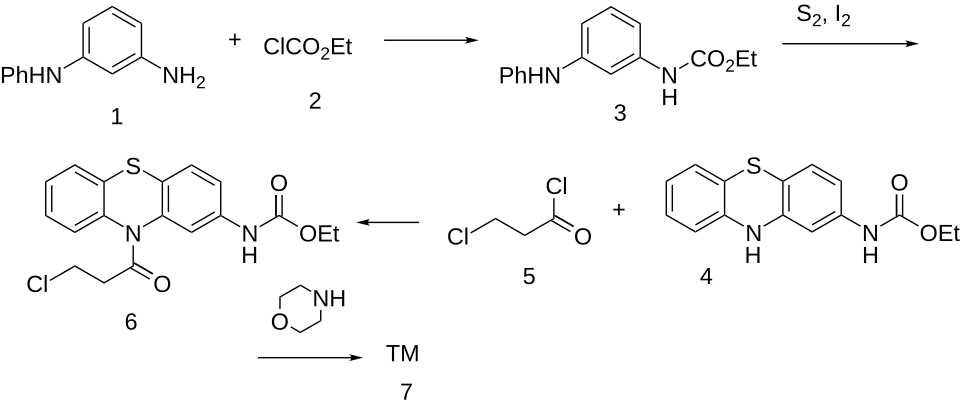 The reaction between N-phenyl-1,3-benzenediamine (1) and ethyl chloroformate (2) gives the carbamate (3). Treatment with sulfur and iodine forms the phenothiazine derivative (4). Amide formation with 3-chloropropionyl chloride (5) gives the penultimate intermediate (6). Alkylation of morpholine by nucleophilic substitution at the sidechain chlorine yields moricizine.[6][7]