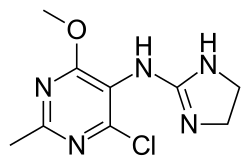 Moxonidine (INN) is a new-generation alpha-2/imidazoline receptor agonist antihypertensive drug licensed for the treatment of mild to moderate essential hypertension.[5][6] It may have a role when thiazides, beta-blockers, ACE inhibitors, and calcium channel blockers are not appropriate or have failed to control blood pressure. In addition, it demonstrates favourable effects on parameters of the insulin resistance syndrome, apparently independent of blood pressure reduction. It is also a growth hormone releaser.[7] It is manufactured by Solvay Pharmaceuticals (acquired by Abbott in 2009) under the brand name Physiotens and Moxon.
