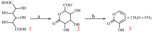 Reaction of mucic acid to 3-hydroxy-2-pyrone with a) potassium bisulfate 160 °C / 4 hrs. b) hydrochloric acid to pH = 7