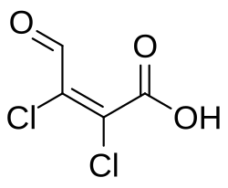 Mucochloric acid is an organic compound with the formula C4H2Cl2O3. It consists of a dichlorinated alkene bearing aldehyde and carboxylic acid functional groups. It is the chlorinated analog of mucobromic acid and one of the known mucohalic acids. Mucochloric acid exists in equilibrium between open-chain and cyclic (furanone hemiacetal) forms, analogous to mucobromic acid. Mucochloric acid occurs as a chlorine disinfection byproduct in drinking water.[2]