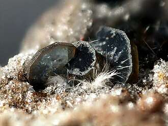 ![]() White, filamentous mullite in front of thicker osumilite platelets (Photo width 1.5 mm) Found in Wannenköpfe, Ochtendung, Eifel, Germany | |