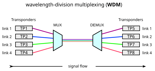 A variant technology, called wavelength-division multiplexing (WDM) is used in optical communications.
