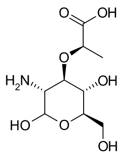 Muramic acid is an amino sugar acid. In terms of chemical composition, it is the ether of lactic acid and glucosamine. It occurs naturally as N-acetylmuramic acid in peptidoglycan, whose primary function is a structural component of many typical bacterial cell walls.[1]
