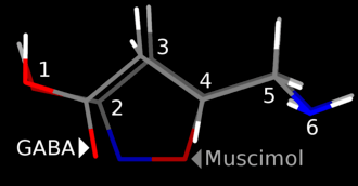 - ^ Brehm L, Frydenvang K, Hansen LM, Norrby PO, Krogsgaard-Larsen P, Liljefors T (December 1997). "Structural features of muscimol, a potent GABAA receptor agonist, crystal structure and quantum chemicalab initio calculations". Structural Chemistry. 8 (6): 443–451. Bibcode:1997StrCh...8..443B. doi:10.1007/BF02311703. S2CID 93397543.