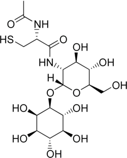 Mycothiol (MSH or AcCys-GlcN-Ins) is an unusual thiol compound found in the Actinomycetota.[1][2] It is composed of a cysteine residue with an acetylated amino group linked to glucosamine, which is then linked to inositol.[3] The oxidized, disulfide form of mycothiol (MSSM) is called mycothione, and is reduced to mycothiol by the flavoprotein mycothione reductase.[4][5] Mycothiol biosynthesis and mycothiol-dependent enzymes such as mycothiol-dependent formaldehyde dehydrogenase and mycothione reductase have been proposed to be good drug targets for the development of treatments for tuberculosis.[6][7]