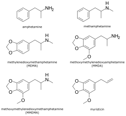 The chemical structure of myristicin is similar to some amphetamine compounds, and it may be capable of producing psychotropic effects.[4] Normal levels of intake of myristicin from spices in food is unlikely to cause these effects.[4] Myristicin can be used in the chemical synthesis of amphetamine derivatives such as the designer drug MMDMA that is similar in structure and effect to MDMA.[5] Out of the common spices that contain myristicin, nutmeg has a high relative concentration of the compound,[2] and therefore is used to exploit the effects of myristicin.[1][2]
