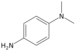 N,N-Dimethylphenylenediamine (dimethyl-4-phenylenediamine) is an organic compound with the formula H2NC6H4N(CH3)2. It is one of the phenylenediamines, a class of compounds that have long attracted attention for their redox properties. This diamine is, for example, easily oxidized to a deep red radical cation, [H2NC6H4N(CH3)2]+ which is called Wurster's Red.[2] The related Wurster's Blue cation has four N-methyl groups (CH3)2NC6H4N(CH3)+2