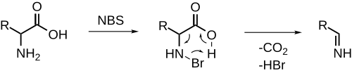 NBS electrophilically brominates the amine, which is followed by decarboxylation and release of an imine. Further hydrolysis will yield an aldehyde and ammonia.[19][20] (cf. non-oxidative PLP dependent decarboxylation)